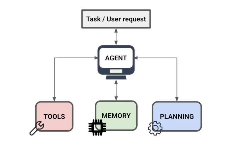 Các tác nhân AI thu hẹp khoảng cách này bằng cách kết hợp các khả năng của LLM với các tính năng bổ sung như bộ nhớ, lập kế hoạch và các công cụ bên ngoài.